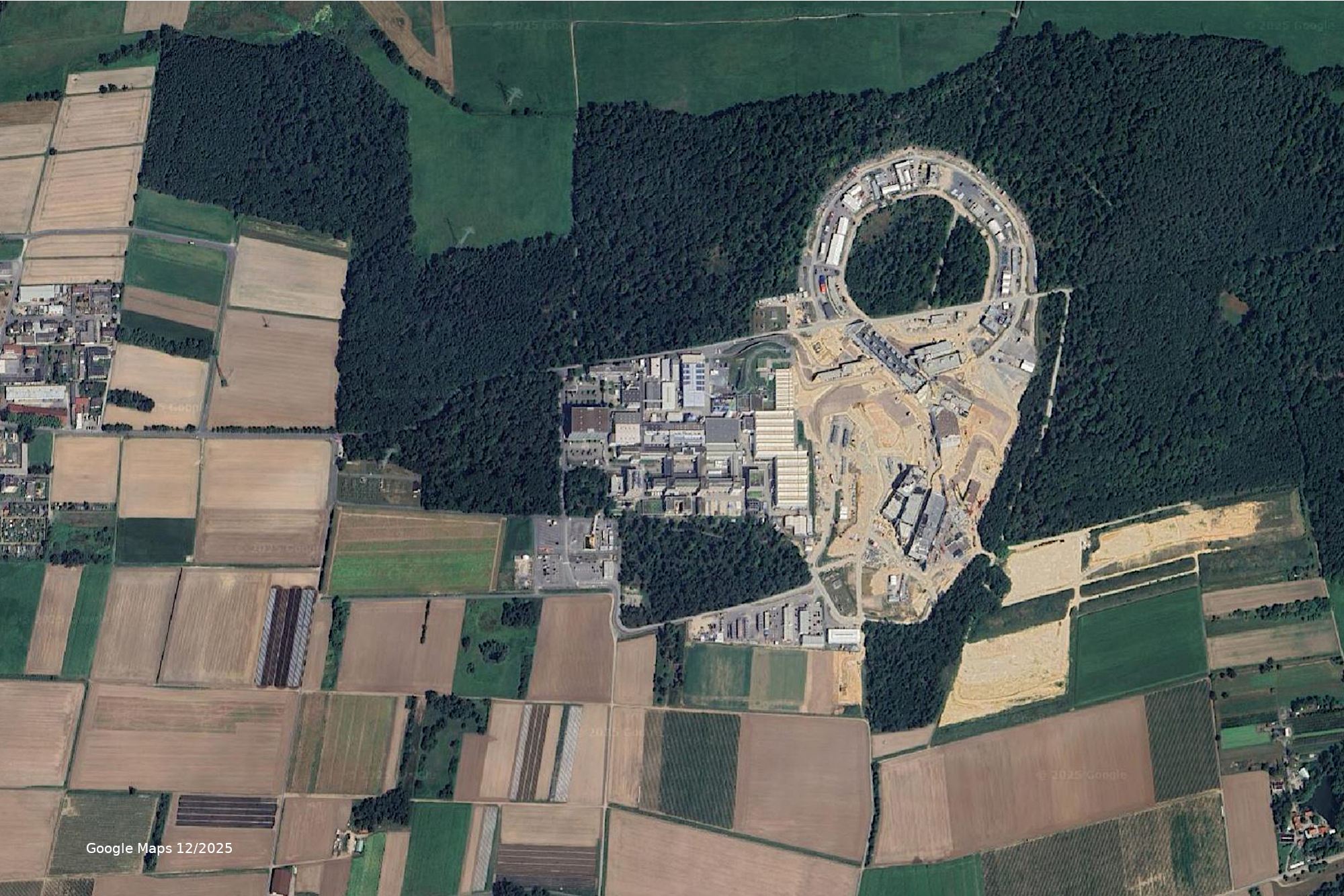 In Darmstadt entsteht aktuell der Teilchenbeschleuniger FAIR (Facility für Antiproton and Ion Research), ein internationales Forschungsprojekt von gradezu gigantischen Ausmaßen. Der Ringbeschleuniger und die dazu gehörigen Gebäude belegen eine Fläche von ca. 20 ha.