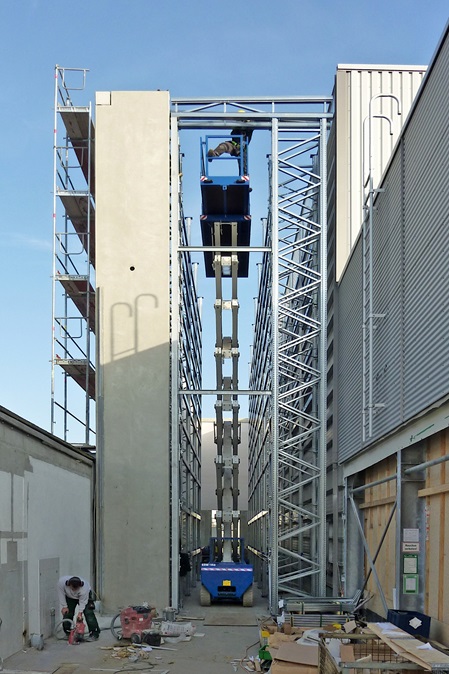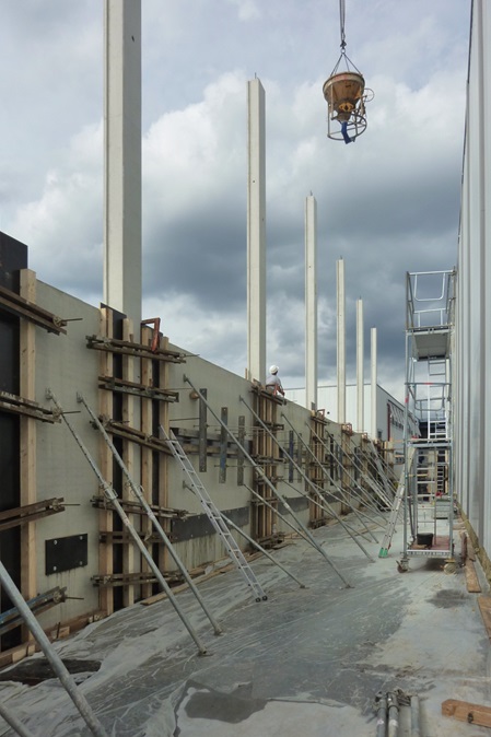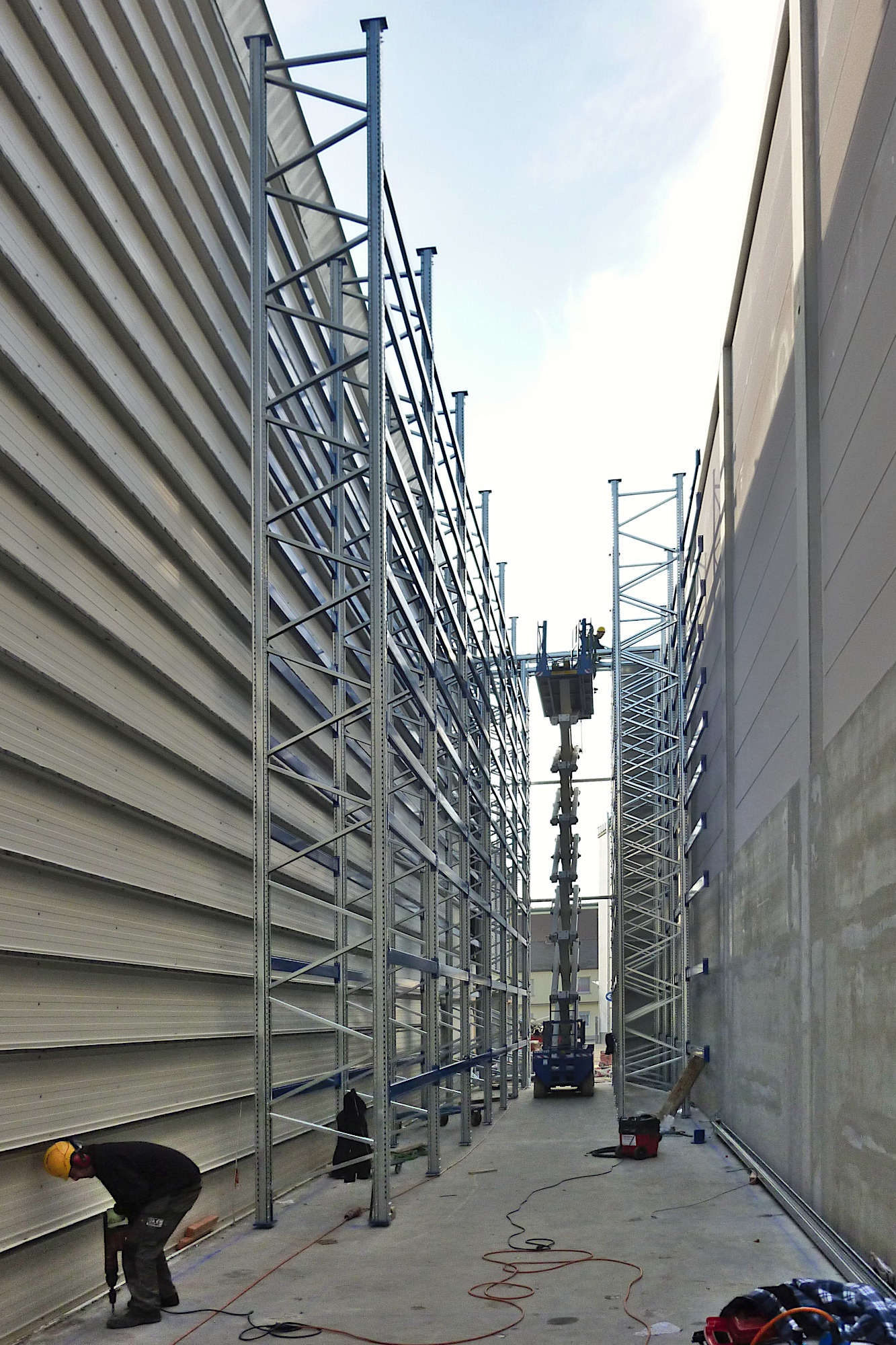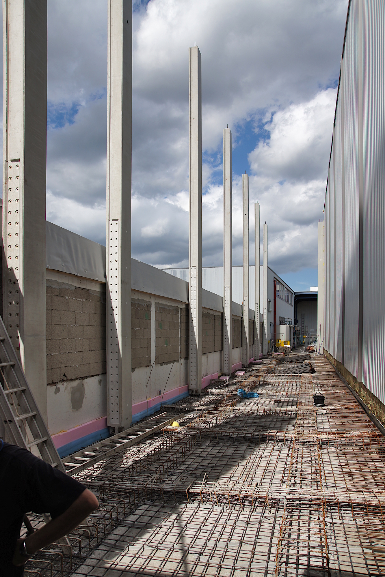 Der Logistikbereich eines Unternehmens sollte vergrößert werden. In einem nur fünf Meter schmalen Streifen zwischen vorhandenen Betriebsgebäuden wurde das Hochregallager um eine neue Gasse erweitert. Von der Herstellung der hochtragfähigen Fundamente bis hin zur Einbringung der über zwölf Meter hohen Spannbeton-Fertigteilstützen stellte uns dieses Bauvorhaben vor diverse bautechnische Herausforderungen.