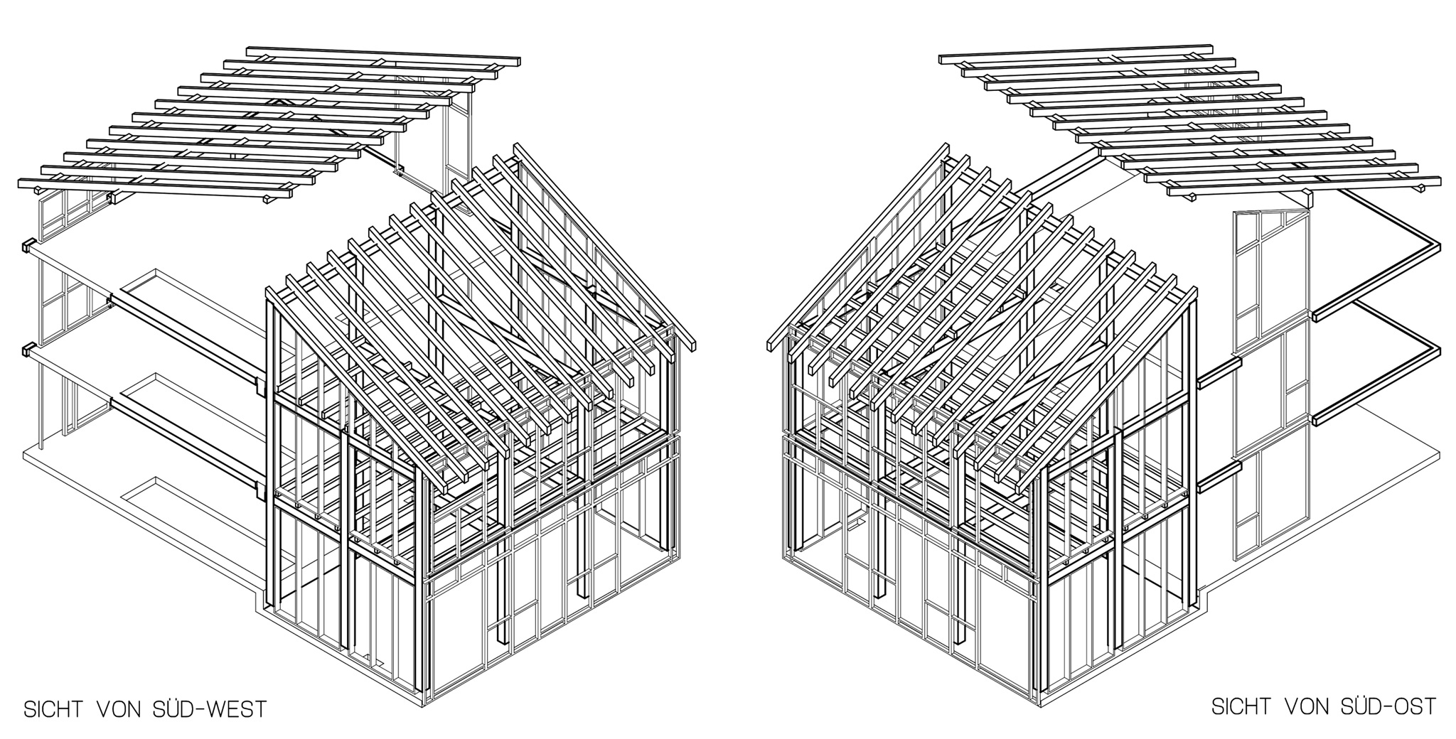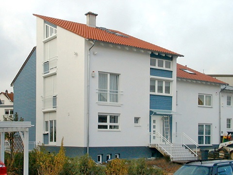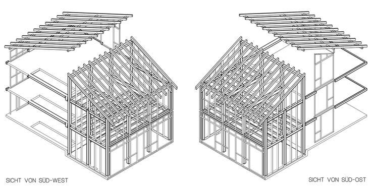 Diesem Haus gelingt es, zwei in Konstruktion und Aussehen ganz unterschiedliche Baukörper zu kombinieren: Der zur Straße orientierte Teil ist als konventioneller Mauerwerksbau in Massivbauweise ausgeführt, der Teil zum Garten ein echtes Holzhaus in Holzständerbauweise.
