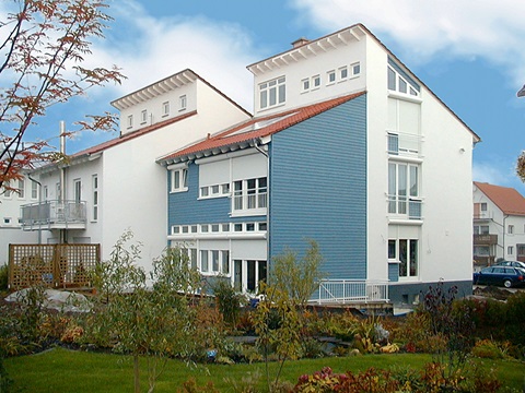 Diesem Haus gelingt es, zwei in Konstruktion und Aussehen ganz unterschiedliche Baukörper zu kombinieren: Der zur Straße orientierte Teil ist als konventioneller Mauerwerksbau in Massivbauweise ausgeführt, der Teil zum Garten ein echtes Holzhaus in Holzständerbauweise.